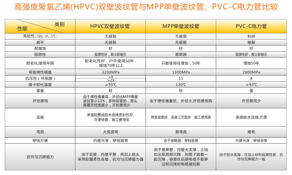 高強度聚氯乙烯(HPVC)雙壁波紋管內、外壁之間呈中空環(huán)狀結構,充分利用工字鋼結構原理,提高截面 慣性矩,環(huán)鋼度高。產品具有強度高、韌性好、質地輕等優(yōu)點。產品運用開挖工程,可代替MPP單壁波紋管、玻璃鋼管、PVC-C電力管、PVC-U通信管等管材。